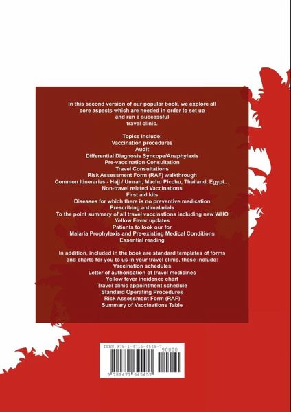 In this eighth version of our popular book, we explore all core aspects which are needed in order to set up and run a successful travel clinic. Topics include: Vaccination procedures Audit Differential Diagnosis Syncope/Anaphylaxis Pre-vaccination Consultation Risk Assessment Form (RAF) walkthrough Common Itineraries - Hajj / Umrah, Machu Picchu, Thailand, Egypt... Non-travel related Vaccinations Diseases for which there is no preventive medication Prescribing antimalarials To the point summary of all travel vaccinations including new WHO Yellow Fever updates Patients to look our for Malaria Prophylaxis and Pre-existing Medical Conditions In addition, included in the book are standard templates of forms and charts for you to us in your travel clinic, these include: Vaccination schedules Letter of authorisation of travel medicines Yellow fever incidence chart Travel clinic appointment schedule Standard Operating Procedures Risk Assessment Form (RAF) Summary of Vaccinations Table