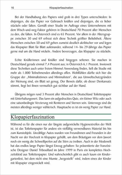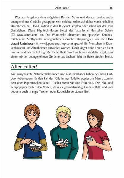 "Das handliche Buch hält neben allerlei Historischem und Kuriosem vor allem Unmengen an Tipps rund ums Defäkieren und Urinieren außerhalb des geschützten Rahmens der heimischen Toilette bereit - eine echte Leseempfehlung für alle, die tiefer ins Thema einsteigen wollen." (Saarbrücker Zeitung) "Das handliche Buch hält neben allerlei Historischem und Kuriosem vor allem Unmengen an Tipps rund ums Defäkieren und Urinieren außerhalb des geschützten Rahmens der heimischen Toilette bereit - eine echte Leseempfehlung für alle, die tiefer ins Thema einsteigen wollen." (Merkur.de) "Der ultimative Klo-Ratgeber für Natur-Liebhaber" (mopo.de) "How to shit in the woods (...) erklärt auf 88 Seiten viel Einleuchtendes zur Theorie des Sich-Erleichterns" (Die ZEIT) "eine gleichermaßen nützliche wie vergnügliche Lektüre" (Wanderlust) "allerhand Tipps für das dringende Bedürfnis in der Wildnis" (BILD)