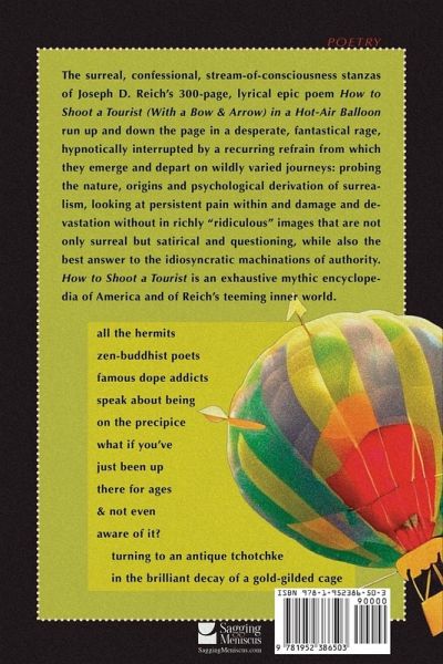 The surreal, confessional, stream-of-consciousness stanzas of Joseph D. Reich's 300-page, lyrical epic poem How to Shoot a Tourist (With a Bow & Arrow) in a Hot-Air Balloon run up and down the page in a desperate, fantastical rage, hypnotically interrupted by a recurring refrain from which they emerge and depart on wildly varied journeys: probing the nature, origins and psychological derivation of surrealism, looking at persistent pain within and damage and devastation without in richly "ridiculous" images that are not only surreal but satirical and questioning, while also the best answer to the idiosyncratic machinations of authority. How to Shoot a Tourist is an exhaustive mythic encyclopedia of America and of Reich's teeming inner world.