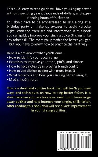 This quick easy to read guide will have you singing better without spending years, thousands of dollars, and experiencing hours of frustration. You don't have to be embarrassed to sing along at a birthday party or make up excuses to avoid karaoke night. With the exercises and information in this book you can quickly improve your singing voice. Singing is like any other skill. The more you practice the better you get. But, you have to know how to practice the right way. Here is a preview of what you'll learn...How to identify your vocal range Exercises to improve your tone, pitch, and timbre How to hold notes by improving breath control How to use diction to sing with more impact What vibrato is and how you can sing better using it Much, much more! This is a short and concise book that will teach you new ways and techniques on how to sing better faster. It is short because you can take your new found knowledge away quicker and help improve your singing skills faster. After reading this book you will see a vast improvement in your singing abilities.
