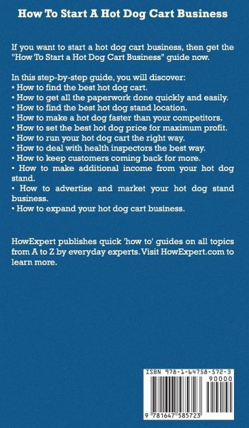 If you want to start a hot dog cart business, then get the How to Start a Hot Dog Cart Business guide now. In this step-by-step guide, you will discover: How to find the best hot dog cart. How to get all the paperwork done quickly and easily. How to find the best hot dog stand location. How to make a hot dog faster than your competitors. How to set the best hot dog price for maximum profit. How to run your hot dog cart the right way. How to deal with health inspectors the best way. How to keep customers coming back for more. How to make additional income from your hot dog stand. How to advertise and market your hot dog stand business. How to expand your hot dog cart business. HowExpert publishes quick 'how to' guides on all topics from A to Z by everyday experts.