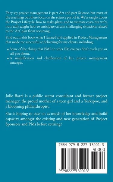 They say project management is part Art and part Science, but most of the teachings out there focus on the science part of it. We're taught about the Project Lifecycle, how to make plans, and to estimate costs, but we're not really taught how to anticipate certain challenging situations related to the 'Art' part from occurring. Find out in this book what I learned and applied in Project Management that made me successful at delivering for my clients, including:Some of the things that PMI or other PM courses don't teach you or tell you about. A simplification and clarification of key project management concepts.