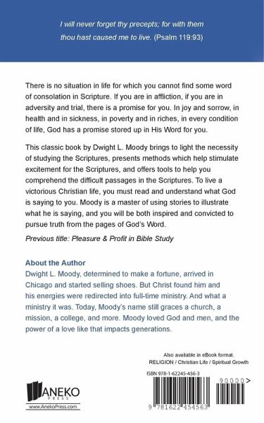 I will never forget thy precepts; for with them thou hast caused me to live. (Psalm 119:93) There is no situation in life for which you cannot find some word of consolation in Scripture. If you are in affliction, if you are in adversity and trial, there is a promise for you. In joy and sorrow, in health and in sickness, in poverty and in riches, in every condition of life, God has a promise stored up in His Word for you. This classic book by Dwight L. Moody brings to light the necessity of studying the Scriptures, presents methods which help stimulate excitement for the Scriptures, and offers tools to help you comprehend the difficult passages in the Scriptures. To live a victorious Christian life, you must read and understand what God is saying to you. Moody is a master of using stories to illustrate what he is saying, and you will be both inspired and convicted to pursue truth from the pages of God’s Word. Previous title: Pleasure & Profit in Bible Study About the Author Dwight L. Moody, determined to make a fortune, arrived in Chicago and started selling shoes. But Christ found him and his energies were redirected into full-time ministry. And what a ministry it was. Today, Moody’s name still graces a church, a mission, a college, and more. Moody loved God and men, and the power of a love like that impacts generations.