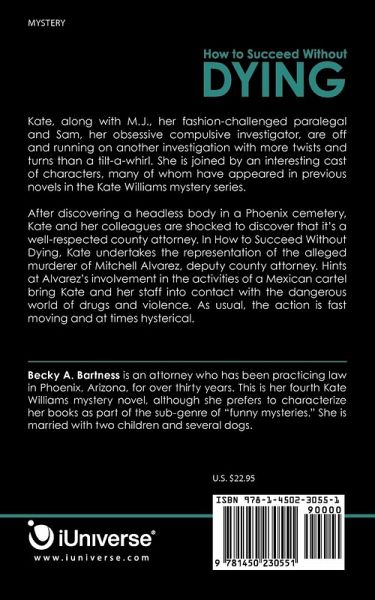 Kate, along with M.J., her fashion-challenged paralegal and Sam, her obsessive compulsive investigator, are off and running on another investigation with more twists and turns than a tilt-a-whirl. She is joined by an interesting cast of characters, many of whom have appeared in previous novels in the Kate Williams mystery series. After discovering a headless body in a Phoenix cemetery, Kate and her colleagues are shocked to discover that it's a well-respected county attorney. In "How to Succeed Without Dying, " Kate undertakes the representation of the alleged murderer of Mitchell Alvarez, deputy county attorney. Hints at Alvarez's involvement in the activities of a Mexican cartel bring Kate and her staff into contact with the dangerous world of drugs and violence. As usual, the action is fast moving and at times hysterical.