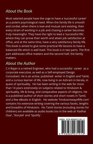 Most salaried people have the urge to have a 'successful career' as a potent psychological need. When the family life is smooth and cordial, when there is love and mutual care existing, then every strain of working in a job and chasing a career becomes truly meaningful. They have the right to lead a 'successful life', where they can prove their worth and attain job satisfaction at office, and at the same time, have a very satisfactory family life. This book is aimed to give some practical life lessons to have a balanced life which is well lived. This book is in two parts. The first part addresses office matters and the second half, the family matters.