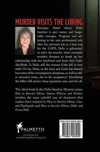 Murder visits the Loring Boutique Hotel where Delia Sanchez is part owner and hospitality manager. Pregnant and adjusting to her new professional role after her previous job as a beat cop for the LAPD, Delia is galvanized to solve the murder when romantic troubles threaten to break up her relationship with her boyfriend and local chef, Gabe MacBride. Is Delia still the woman Gabe fell in love with? Or has Delia, as she fears and Gabe has hinted, lost some of her investigatory sharpness, as well as other attractive traits, due to her pregnancy? Identifying the killer will answer these questions once and for all. The third book in the Delia Sanchez Mystery series, How to Survive Ghosts, Gators, Whores, and Traitors involves the same colorful cast of characters that readers have enjoyed in How to Survive Ghosts, Cats, and Psychopaths and How to Survive Ghosts, Dolls, and Fresco Falls.