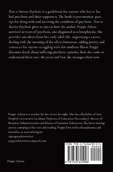How to Survive Psychosis is a guidebook for anyone who has or has had psychosis and their supporters. The book is part-memoir, part tips for living with and surviving the condition of psychosis. How to Survive Psychosis gives 10 tips on how the author, Poppy Atkins survived 20 years of psychosis, also diagnosed as schizophrenia. She provides anecdotes from her early adult life, negotiating a career, dealing with the meaning of the often innocuous, adding poetry and resources for anyone struggling with this insidious illness. Poppy discusses detail about suffering psychotic episodes, how she came to understand them over the years and how she manages them now. She cites actions and resources that have helped get well and how she manages to 'stay sane' in her life today.