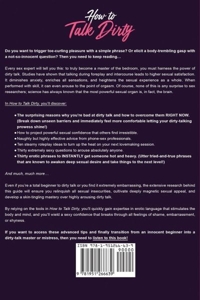 Do you want to trigger toe-curling pleasure with a simple phrase? Or elicit a body-trembling gasp with a not-so-innocent question? Then you need to keep reading… Every sex expert will tell you this: to truly become a master of the bedroom, you must harness the power of dirty talk. Studies have shown that talking during foreplay and intercourse leads to higher sexual satisfaction. It diminishes anxiety, enriches all sensations, and heightens the sexual experience as a whole. When performed with skill, it can even arouse to the point of orgasm. Of course, none of this is any surprise to sex researchers; science has always known that the most powerful sexual organ is, in fact, the brain. In How to Talk Dirty, you’ll discover: The surprising reasons why you’re bad at dirty talk and how to overcome them RIGHT NOW. (Break down unseen barriers and immediately feel more comfortable letting your dirty-talking prowess shine!) How to project powerful sexual confidence that others find irresistible. Naughty but highly effective advice from phone-sex professionals. Ten steamy roleplay ideas to turn up the heat on your next lovemaking session. Thirty extremely sexy questions to arouse absolutely anyone. Thirty erotic phrases to INSTANTLY get someone hot and heavy. (Utter tried-and-true phrases that are known to awaken deep sexual desire and take things to the next level!) And much, much more… Even if you’re a total beginner to dirty talk or you find it extremely embarrassing, the extensive research behind this guide will ensure you relinquish all sexual insecurities, cultivate deeply magnetic sexual appeal, and develop a skin-tingling mastery over highly arousing dirty talk. By relying on the tools in How to Talk Dirty, you’ll quickly gain expertise in erotic language that stimulates the body and mind, and you’ll wield sexy confidence that breaks through all feelings of shame, embarrassment, or shyness. If you want to access these advanced tips and finally transition from an innocent beginner into a dirty-talk master or mistress, then you need to listen to this book!