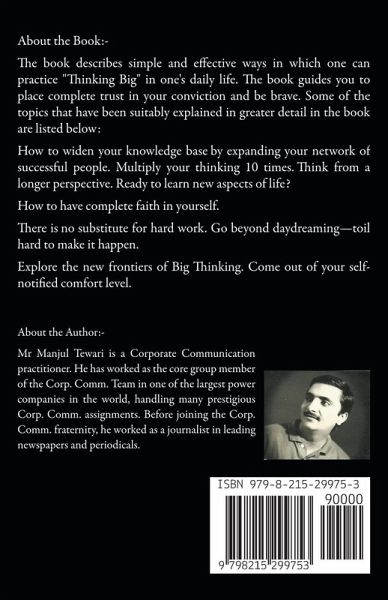 What this book will offer youThe book describes simple and effective ways in which one can practice "Thinking Big" in one's daily life. The book guides you to place complete trust in your conviction and be brave. Some of the topics that have been suitably explained in greater detail in the book are listed below: How to widen your knowledge base by expanding your network of successful people. Multiply your thinking 10 times. Think from a longer perspective. Ready to learn new aspects of life? How to have complete faith in yourself. There is no substitute for hard work. Go beyond daydreaming—toil hard to make it happen. Explore the new frontiers of Big Thinking. Come out of your self-notified comfort level. Achievers and big thinkers jump into sports regardless of being given a formal invitation. Accomplished people are self-advocates. The Whys and Whats of Our Big Picture. Define your why before you dive in Knowing the latest trends is key to your success. Stay flexible with your ideas, but be firm in your vision. Don't forget the importance of marketing and advertising when thinking big. Understanding the influence of thinking big. Motivation is taking action daily. Success and big thinking are correlated. From this book you will learn how to:Have an undivided focus on your goal. Mindset, more than intellect, matters. Stay focused on your vision. Big dreams are to be given due reverence and respect. Seek out help and the universe has a way of assisting you. Know your areas of control and limitations. Channelize the positive energies of the people around you. An accomplished person knows how to move on from a defeat. Achievers and big thinkers go for the big-ticket experience. To take the prudent direction of achievement. Have total faith in yourself. Applying your secret dream from "me to we" to make it a reality. Revaluate your strategy and adapt to change as you move forward. Visualize and Assess Your Assets. Take the first baby step and, thereafter, take one small step at a time. The book focuses on the following areas in great detail: What is the Magic of Thinking Big and Being Successful? How to Become a Big Picture Thinker. Get out of the box and generate creative ideas; Setting Goals after due diligence; Essential Keys to Drive the Big Thinking Process; How Big Thinking Can Lead to Success; How Big Picture Thinkers have limitless boundaries. This book equips its readers with innovative and creative strategies to think big. Since these have been tried and tested by thinkers and philosophers, if they have worked for them, they should work for us. (Yes, I am in the same boat.) I am confident that these will work for you and me as well. Thinking Big is for all those who can think. It is not a realm of the matter solely for a select few. Thinking Big is for anyone who wants to think and act differently. So let us just start the process of thinking big as explained in the book and try to bring innovation into our lives.