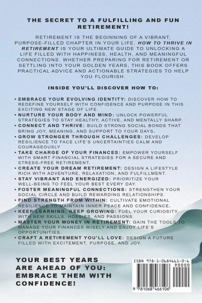 How to Thrive in Retirement The Secret to a Fulfilling and Fun Retirement! Retirement is the beginning of a vibrant, purpose-filled chapter in your life. How to Thrive in Retirement is your ultimate guide to unlocking a life filled with happiness, health, and meaningful connections. Whether preparing for retirement or settling into your golden years, this book offers practical advice and actionable strategies to help you flourish. Inside You'll Discover how to: Embrace Your Evolving Identity: Discover how to redefine yourself with confidence and purpose in this exciting new stage of life. Nurture Your Body and Mind: Unlock powerful strategies to stay healthy, active, and mentally sharp. Connect and Thrive: Build strong social bonds that bring joy, meaning, and support to your days. Grow Stronger Through Challenges: Develop resilience to face life's uncertainties calmly and courageously. Take Charge of Your Finances: Empower yourself with smart financial strategies for a secure and stress-free retirement. Create Your Dream Retirement: Design a lifestyle rich with adventure, relaxation, and fulfilment. Stay Vibrant and Energized: Prioritize your well-being to feel your best every day. Foster Meaningful Connections: Strengthen your social circle and build rewarding relationships. Find Strength from Within: Cultivate emotional resilience to maintain inner peace and confidence. Keep Learning, Keep Growing: Fuel your curiosity with new skills, hobbies, and passions. Master Your Money in Retirement: Gain the tools to manage your finances wisely and enjoy life's opportunities. Craft a Retirement You'll Love: Design a future filled with excitement, purpose, and joy.
