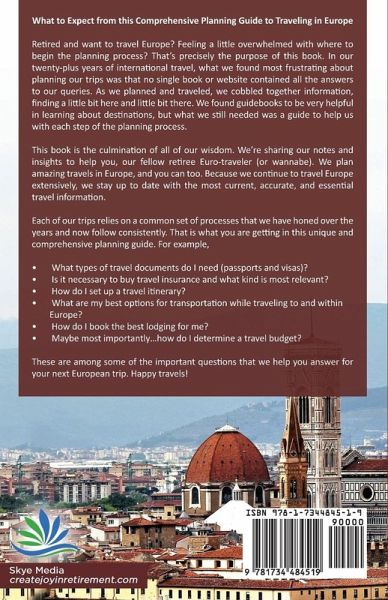 What to Expect from this Comprehensive Planning Guide to Traveling in Europe If you're like many retirees who are now considering international travel, your foremost question is, 'where do I begin?' In our twenty-plus years of international travel what we found most frustrating about the planning process was that no single book or website contained all the answers to our queries. As we planned and traveled, we cobbled together information, finding a little bit here and little bit there. We found guidebooks to be very helpful in learning about destinations, but what we still needed was a guide to help us with each step of the planning process. To plan and manage our own travels, we began compiling our notes along the way. We documented what worked and what didn't. After years of traveling, we're confident in our planning process and actually enjoy putting in the time and work, knowing that it will result in an enjoyable trip. We're sharing our notes and insights to help you, our fellow retiree Euro-traveler (or wannabe). We know that these tips and strategies will help you enjoy your planning, anticipate potential challenges, and travel with confidence. Throughout the years, we've had friends say to us, 'wow, that trip sounds amazing, who helped you plan it, or who is your travel agent?' They always seem surprised when we say we planned it ourselves... followed almost always with, 'I don't think I could do that.' Well, you CAN do it, and we can help. Because we are continuing to travel Europe extensively, we stay up to date with the most current, accurate, and essential travel information. Each of our trips relies on a common set of processes that we have honed over the years and now follow consistently. That is what you are getting in this unique and comprehensive planning guide. For example, · What types of travel documents do I need (passports and visas)? · Is it necessary to buy travel insurance and what kind is most relevant? · How do I set up a travel itinerary? · What are my best options for transportation while traveling to and within Europe? · How do I book the best lodging for me? · Maybe most importantly...how do I determine a travel budget? These are among some of the important questions that we help you answer for your next European trip. Happy planning! Brian and Linda Garavalia P.S. You can take a journey with us by following our Facebook page, Create Joy in Retirement, and our travel blog at CreateJoyinRetirement.com.
