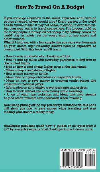 If you could go anywhere in the world, anywhere at all with no strings attached, where would it be? Every person in the world has an answer to that. It may not be far, or exotic, or even famous, but everyone wants to travel somewhere. The biggest hold up for most people is money. It's not cheap to fly halfway across the world stay in hotels, eat out every night, or see shows and entertainment. What if I told you with a few simple tips you can save thousands on your dream trip? Traveling doesn't need to expensive or overpriced. With this book, you'll learn: • How to save hundreds when booking a flight. • How to add up miles with everyday purchases to find free or discounted flights. • Tips on how to find cheap flights, even at the last minute. • Other cheap alternatives to flights. • How to save money on hotels. • About free or cheap alternatives to staying in hotels. • Ideas on how to save money in common tourist places like museums or national parks. • Information on all-inclusive travel packages and cruises. • How to work abroad and earn money while traveling. • A ton of other tips, websites, and ideas that have already helped other travelers save thousands when traveling. Don't keep putting off the trip you always wanted to do; this book will show you how to save money while traveling and start making your dream a reality today. HowExpert publishes quick 'how to' guides on all topics from A to Z by everyday experts.