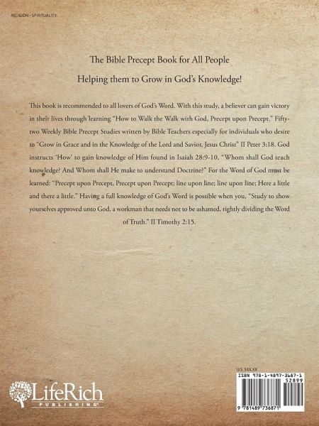 The Bible Precept Book for All People Helping them to Grow in God's Knowledge! This book is recommended to all lovers of God's Word. With this study, a believer can gain victory in their lives through learning "How to Walk the Walk with God, Precept upon Precept." Fifty-two Weekly Bible Precept Studies written by Bible Teachers especially for individuals who desire to "Grow in Grace and in the Knowledge of the Lord and Savior, Jesus Christ" II Peter 3:18. God instructs 'How' to gain knowledge of Him found in Isaiah 28:9-10, "Whom shall God teach knowledge? And Whom shall He make to understand Doctrine?" For the Word of God must be learned: "Precept upon Precept, Precept upon Precept; line upon line; line upon line; Here a little and there a little." Having a full knowledge of God's Word is possible when you, "Study to show yourselves approved unto God, a workman that needs not to be ashamed, rightly dividing the Word of Truth." II Timothy 2:15.
