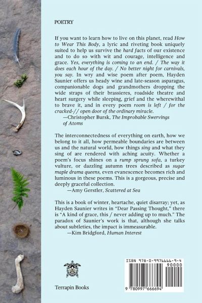 If you want to learn how to live on this planet, read How to Wear This Body, a lyric and riveting book uniquely suited to help us survive the hard facts of our existence and to do so with wit and courage, intelligence and grace. Yes, everything is coming to an end. / The way it does each hour of the day. No better night for carnivals, you say. In wry and wise poem after poem, Hayden Saunier offers us heady wine and late-season asparagus, companionable dogs and grandmothers dropping the wide straps of their brassieres, roadside theatre and heart surgery while sleeping, grief and the wherewithal to brave it, and in every poem room is left / for the cracked-// open door of the ordinary miracle. —Christopher Bursk