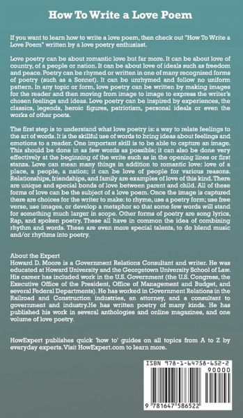 If you want to learn how to write a love poem, then check out "How To Write a Love Poem" written by a love poetry enthusiast. Love poetry can be about romantic love but far more. It can be about love of country, of a people or nation. It can be about love of ideals such as freedom and peace. Poetry can be rhymed or written in one of many recognized forms of poetry (such as a Sonnet). It can be unrhymed and follow no uniform pattern. In any topic or form, love poetry can be written by making images for the reader and then moving from image to image to express the writer’s chosen feelings and ideas. Love poetry can be inspired by experiences, the classics, legends, heroic figures, patriotism, personal ideals or even the works of other poets. The first step is to understand what love poetry is: a way to relate feelings to the art of words. It is the skillful use of words to bring ideas about feelings and emotions to a reader. One important skill is to be able to capture an image. This should be done in as few words as possible; it can also be done very effectively at the beginning of the write such as in the opening lines or first stanza. Love can mean many things in addition to romantic love: love of a place, a people, a nation; it can be love of people for various reasons. Relationships, friendships, and family are examples of love of this kind. There are unique and special bonds of love between parent and child. All of these forms of love can be the subject of a love poem. Once the image is captured there are choices for the writer to make: to rhyme, use a poetry form; use free verse, use images, or develop a metaphor so that some few words will stand for something much larger in scope. Other forms of poetry are song lyrics, Rap, and spoken poetry. These all have in common the idea of combining rhythm and words. These are even more special talents, to do blend music and/or rhythms into poetry. About the Expert Howard D. Moore is a Government Relations Consultant and writer. He was educated at Howard University and the Georgetown University School of Law. His career has included work in the U.S. Government (the U.S. Congress, the Executive Office of the President, Office of Management and Budget, and several Federal Departments). He has worked in Government Relations in the Railroad and Construction industries, an attorney, and a consultant to government and industry. He has written poetry of many kinds. He has published his work in several anthologies and online magazines, and one volume of love poetry. HowExpert publishes quick 'how to' guides on all topics from A to Z by everyday experts.