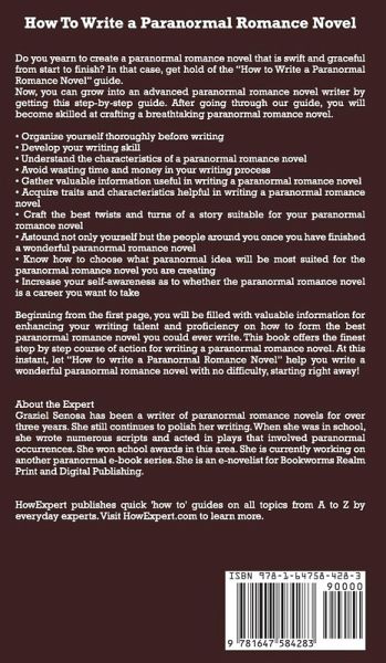 Do you yearn to create a paranormal romance novel that is swift and graceful from start to finish? In that case, get hold of the "How to Write a Paranormal Romance Novel" guide. Now, you can grow into an advanced paranormal romance novel writer by getting this step-by-step guide. After going through our guide, you will become skilled at crafting a breathtaking paranormal romance novel. - Organize yourself thoroughly before writing - Develop your writing skill - Understand the characteristics of a paranormal romance novel - Avoid wasting time and money in your writing process - Gather valuable information useful in writing a paranormal romance novel - Acquire traits and characteristics helpful in writing a paranormal romance novel - Craft the best twists and turns of a story suitable for your paranormal romance novel - Astound not only yourself but the people around you once you have finished a wonderful paranormal romance novel - Know how to choose what paranormal idea will be most suited for the paranormal romance novel you are creating - Increase your self-awareness as to whether the paranormal romance novel is a career you want to take Beginning from the first page, you will be filled with valuable information for enhancing your writing talent and proficiency on how to form the best paranormal romance novel you could ever write. This book offers the finest step by step course of action for writing a paranormal romance novel. At this instant, let "How to write a Paranormal Romance Novel" help you write a wonderful paranormal romance novel with no difficulty, starting right away! About the Expert Graziel Senosa has been a writer of paranormal romance novels for over three years. She still continues to polish her writing. When she was in school, she wrote numerous scripts and acted in plays that involved paranormal occurrences. She won school awards in this area. She is currently working on another paranormal e-book series. She is an e-novelist for Bookworms Realm Print and Digital Publishing. Graziel’s main hobby is investigating the unknown. She loves to research astrology, urban legends, civilizations, and creatures whose existence is under debate. She studies phenomena and events not yet explained by science. HowExpert publishes quick 'how to' guides on all topics from A to Z by everyday experts.