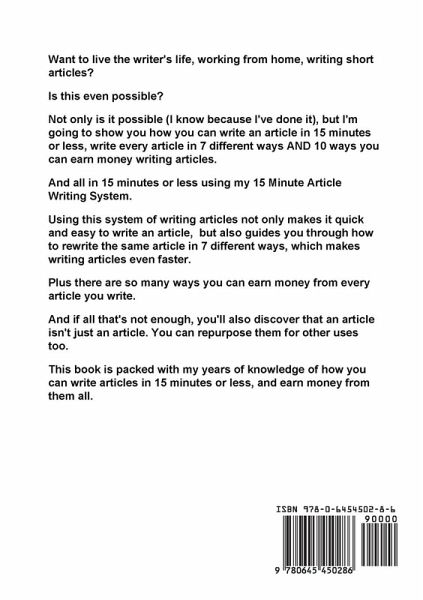 Want to live the writer's life, working from home, writing short articles? Is this even possible? Not only is it possible (I know because I've done it), but I'm going to show you how you can write an article in 15 minutes or less, write every article in 7 different ways AND 10 ways you can earn money writing articles. And all in 15 minutes or less using my 15 Minute Article Writing System. Using this system of writing articles not only makes it quick and easy to write an article, but also guides you through how to rewrite the same article in 7 different ways, which makes writing articles even faster. Plus there are so many ways you can earn money from every article you write. And if all that's not enough, you'll also discover that an article isn't just an article. You can repurpose them for other uses too. This book is packed with my years of knowledge of how you can write articles in 15 minutes or less, and earn money from them all.