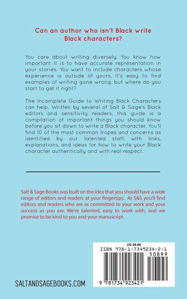 Can an author who isn't Black write Black characters? You care about writing diversely. You know how important it is to have accurate representation in your stories. You want to include characters whose experience is outside of yours. It's easy to find examples of writing gone wrong, but where do you start to get it right? The Incomplete Guide to Writing Black Characters can help. Written and collaborated by several of Salt & Sage's Black editors and sensitivity readers, this guide is a compilation of important things you should know before you sit down to write a Black character. You'll find 10 of the most common tropes and concerns as identified by our talented staff, with links, explanations, and ideas for how to write your Black character authentically and with real respect. By no means is this exhaustive, but it is a great place to start. The print book is around 100 pages long. Disclaimer: No one book or perspective can reflect the diverse experiences of Black folx, nor should you use this as your only guide. We strongly encourage you to hire a sensitivity reader (or several!), to listen to Black voices, and to read #ownvoices books by Black authors. This Guide was written entirely by our Black sensitivity readers. Check out all of our sensitivity readers at https://www.saltandsagebooks.com/sensitivity-expert-readers/. A portion of the proceeds from the sale of this book will be donated to Black Lives Matter.