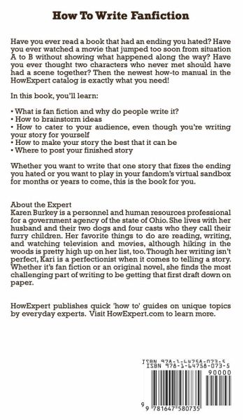 Have you ever read a book that had an ending you hated? Have you ever watched a movie that jumped too soon from situation A to B without showing what happened along the way? Have you ever thought two characters who never met should have had a scene together? Then the newest how-to manual in the HowExpert catalog is exactly what you need! In this book, you’ll learn: • What is fan fiction and why do people write it? • How to brainstorm ideas • How to cater to your audience, even though you’re writing your story for yourself • How to make your story the best that it can be • Where to post your finished story Whether you want to write that one story that fixes the ending you hated or you want to play in your fandom’s virtual sandbox for months or years to come, this is the book for you. About the Expert Karen Burkey is a personnel and human resources professional for a government agency of the state of Ohio. She lives with her husband and their two dogs and four casts who they call their furry children. Her favorite things to do are reading, writing, and watching television and movies, although hiking in the woods is pretty high up on her list, too. Though her writing isn’t perfect, Kari is a perfectionist when it comes to telling a story. Whether it’s fan fiction or an original novel, she finds the most challenging part of writing to be getting that first draft down on paper. HowExpert publishes quick 'how to' guides on all topics from A to Z by everyday experts.