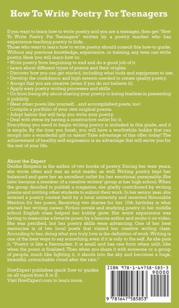If you want to learn how to write poetry and you are a teenager, then get "How To Write Poetry For Teenagers" written by a poetry teacher who has experience teaching poetry to kids. Those who want to learn how to write poetry should consult this how-to guide. Without any previous knowledge, experience, or training, any teen can write poetry. Here you will learn how to: - Write poetry from beginning to end and do a good job of it. - Learn about different types of poems and their origins. - Discover how you can get started, including what tools and equipment to use. - Develop the confidence and high esteem needed to create quality poetry. - Accept that you are creative (even if you do not believe it). - Apply easy poetry writing processes and skills. - Go from being shy about sharing your poetry to being fearless in presenting it publicly. - Meet other poets like yourself…and accomplished poets, too! - Compile a portfolio of your own original poems. - Adopt habits that will help you write your poetry. - Deal with stress by having a constructive outlet for it. Everything you need to begin writing poetry is included in this guide, and it is simple. By the time you finish, you will have a worthwhile hobby that can morph into a wonderful gift or talent! Take advantage of this offer today! The achievement of healthy self-expression is an advantage that will serve you for the rest of your life. About the Expert Deidre Simpson is the author of two books of poetry. During her teen years, she wrote often and was an avid reader as well. Writing poetry kept her balanced and gave her an excellent outlet for her emotional personality. She later became a member of a creative writers' group at her high school. When the group decided to publish a magazine, she gladly contributed by writing poems and inviting other students to submit their work. In her senior year, she entered a poetry contest held by a local university and received Honorable Mention for her poem. Receiving two diaries for her 10th birthday is what started her writing career. Fiction novels and studying poetry in her middle school English class helped her hobby grow. Her worst experience was having to memorize a favorite poem by a famous author and recite it on video. She was petrified, but her poetry skills were advancing. One of her best memories is of two local poets that visited her creative writing class. According to her, doing what you truly love is the definition of work. Writing is one of the best ways to say something, even if it is only to the self. As she puts it, "Poetry is like a firecracker. It is small and has one form when unlit, like when the poem is finalized. Then when you share it with someone or a group of people, much like lighting it, it shoots into the sky and becomes a huge, beautiful, untouchable cloud after the rain." HowExpert publishes quick 'how to' guides on all topics from A to Z by everyday experts.