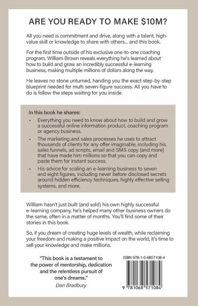 Are you ready to make $10M? All you need is commitment, drive, a talent, high-value skill or knowledge to share with others through an information product, coaching service or agency offer... and this book. For the first time outside of his exclusive coaching programme, William Brown reveals everything he's learned about how to build and scale an incredibly successful e-learning business, making multiple millions of dollars along the way. He leaves no stone unturned, handing you the exact step-by-step blueprint needed for multi-seven-figure success - all you have to do is follow the steps. In this book he shares:Everything you need to know about how to build and grow a successful online information product, coaching program or agency business. The marketing and sales processes he uses to attract thousands of clients for any offer imaginable, including his sales funnels, ad scripts, email and SMS copy (and more) that have made him millions so that you can copy and paste them for instant success. His advice for scaling an e-learning business to seven and eight figures, including never before disclosed secrets around hidden efficiency techniques, highly effective selling systems, and more. Tips on how to look after yourself as the CEO of a highly successful and growing business in order to maximise your income in the shortest time possible. William hasn't just built (and sold) his own highly successful e-learning company, he's helped many other business owners do the same, often in a matter of months. You'll find some of their stories in this book. So, if you dream of creating huge levels of wealth, while reclaiming your freedom and making a positive impact on the world, it's time to sell your knowledge and make millions.