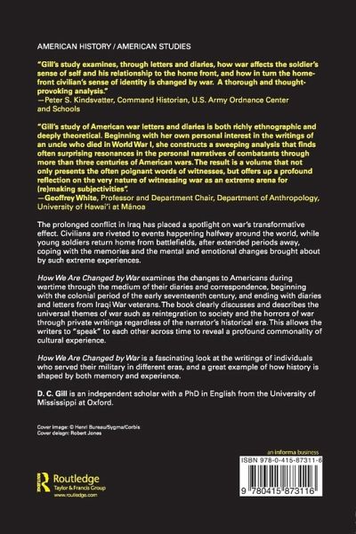 How We Are Changed by War examines our sense of ourselves through the medium of diaries and wartime correspondence, beginning with the colonists of the early seventeenth century, and ending with the diaries and letters from Iraqi war vets. The book tracks the effects of war in private writings regardless of the narrator's historical era allowing the writers to 'speak' to each other across time to reveal a profound commonality of cultural experience. Finally, interpreting the narratives by how the writers conveyed the content adds a richer layer of meaning through the lenses of psychology and literary criticism, providing a model for any society to examine itself through the medium of its members' informal writings.