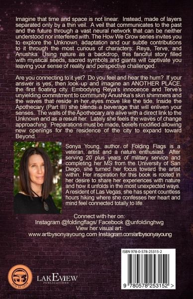 Imagine that time and space is not linear. Instead, made of layers separated only by a thin veil. A veil that communicates to the past and the future through a vast neural network that can be neither understood nor interfered with. The How We Grow series invites you to explore the Unknown, adaptation and our subtle contributions to it through the most curious of characters: Reya, Terve, and Anushka. Using nature as a backdrop, this fanciful story filled with mystical seeds, sacred symbols and giants will captivate you leaving your sense of reality and perspective challenged. Are you connecting to it yet? Do you feel and hear the hum? If your answer is yes, then look up and imagine an ANOTHER PLACE, the first floating city. Embodying Reya's innocence and Terve's unyielding commitment to community Anushka's skin shimmers and the waves that reside in her eyes move like the tide. Inside the Apothecary (Part III) she blends a beverage that will enliven your senses. The walls of the Apothecary are alive with a direct link to the Unknown and as a result her. Lately she feels the waves of change approaching. Preparations must be made, beliefs modified allowing new openings for the residence of the city to expand toward Beyond.