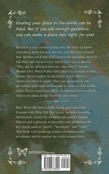 Finding your place in the world can be hard. But if you ask enough questions... you can make a place just right for you! Hector is a very curious young owl. He wants to know everything about his nest, his tree, and the forest around him. Mother and Father Owl answer his questions the best that they can, but not every question is easy to answer. "Why are we different from the other birds?" he asks Mother Owl. When Father Owl asks if he is ready to find a mate, Hector replies he decidedly is not! There is simply too much to learn! There are questions to ask, adventures to be had, and humans to observe. And all the while, Hector must learn the most important lesson of all: what is his place in this forest he calls home? How Wise Old Owl Got His Name, part one in the Lessons with Wise Old Owl series, includes beautiful illustrations created by oil landscape painter Sandra Difazio and a glossary of phonetics and definitions for key words such as "perch", "nocturnal", and "valley". This book will encourage readers to embrace self-acceptance and to explore the world around them.