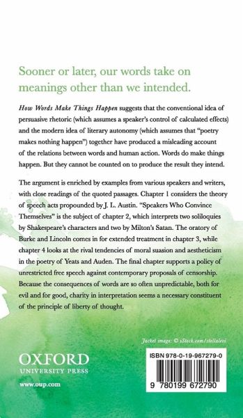 Sooner or later, our words take on meanings other than we intended. How Words Make Things Happen suggests that the conventional idea of persuasive rhetoric (which assumes a speaker's control of calculated effects) and the modern idea of literary autonomy (which assumes that 'poetry makes nothing happen') together have produced a misleading account of the relations between words and human action. Words do make things happen. But they cannot be counted on to produce the result they intend. This volume studies examples from a range of speakers and writers and offers close readings of their words. Chapter 1 considers the theory of speech-acts propounded by J.L. Austin. 'Speakers Who Convince Themselves' is the subject of chapter 2, which interprets two soliloquies by Shakespeare's characters and two by Milton's Satan. The oratory of Burke and Lincoln come in for extended treatment in chapter 3, while chapter 4 looks at the rival tendencies of moral suasion and aestheticism in the poetry of Yeats and Auden. The final chapter, a cause of controversy when first published in the London Review of Books, supports a policy of unrestricted free speech against contemporary proposals of censorship. Since we cannot know what our own words are going to do, we have no standing to justify the banishment of one set of words in favour of another.