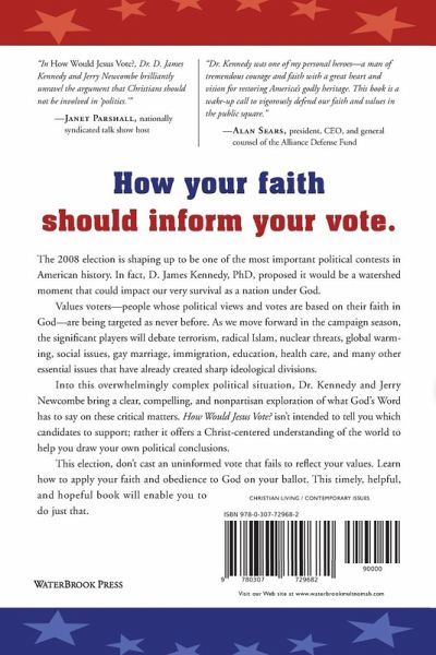 How your faith should inform your vote. The 2008 election is shaping up to be one of the most important political contests in American history. In fact, Dr. D. James Kennedy believes it will be a watershed moment that could impact our very survival as a nation under God. Values voters-people whose political views and votes are based on their faith in God-are being targeted as never before. As we move forward in the campaign season, the significant players will debate terrorism, radical Islam, nuclear threats, global warming, social issues, gay marriage, immigration, education, health care, and many other essential issues that can create sharp ideological divisions. Into this overwhelmingly complex political situation, Dr. Kennedy and Jerry Newcombe bring a clear, compelling, and nonpartisan exploration of what God's Word has to say on these critical matters. How Would Jesus Vote? isn't intended to tell you which candidates to support; rather it offers you a Christ-centered understanding of the world to help you draw your own political conclusions. This election, don't cast an uninformed vote that fails to reflect your values. Instead, learn how to apply your faith and obedience to God to your ballot. This timely, helpful, and hopeful book will enable you to do just that. Those who have a traditional Christian worldview are, frankly, different from other voters. Their worldview-their biblical faith-shapes every stand they take on the political issues that will determine our nation's future. That's the kind of voter you are, or want to be. And that's why How Would Jesus Vote? is so vitally important. Issues you'll explore in this book include: · The polarization of Republican and Democratic parties: Does Christianity play a role? · National defense and the military: Can war ever be biblically justified? · Church and state and religious liberty: How far should faith influence governmental policy? · Homosexuality, same-sex marriage, and gay adoption: Where should we draw the lines? · Economics and the poor: Does the Bible teach socialism? Get a biblical consideration of such controversial issues with trustworthy guidance for determining how your faith will inform your vote.