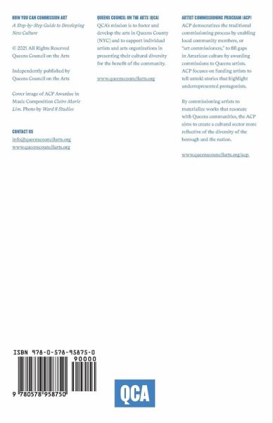 What does it mean to commission art? Picture the people who typically commission art. If you're like most of us, you've likely conjured up an image of Kings, Queens, and the cultural elite (whatever that means). And you'd be right: historically, art commissioning has been an immensely privileged process. Yet it doesn't have to be this way. What if we created a better system so that anyone could commission art? If you were to design your own art commission, what would that look like? Born out of Queens Council on the Arts' Artist Commissioning Program, this book will walk you through how to create your own art commission. In eight easy steps (and an interactive workbook!), you'll learn how to develop new culture - culture that resonates with your community and reflects your values. We know that everyday people can commission art. For years, we've watched Queens art lovers of all walks of life produce new, meaningful work that tells untold stories important to their communities. Now, it's your turn. Don't be confined to the culture that already exists. Commission the art you want to see in the world.