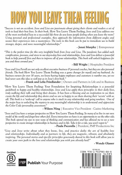 Every decision you make related to the important relationships in your life is an opportunity to build deeper trust, understanding, and respect. When the people you connect with feel that you care about them and appreciate them, the bonds you create have the potential to become unbreakable. In this illuminating book, professional life coaches Jesse and Lisa Ferrell reveal the key ingredients to build - or restore - healthy and fulfilling relationships. They describe the life-changing self-care practices that spark joy and cultivate resiliency, and explore the concepts of turning crisis into abundance, living your life by design, and the Umuntu factor, the power of community. The authors unveil five guiding principles for work and relationships, a wealth of self-assessment tools, and action steps that serve as a roadmap for success in your career and personal life. We are all blessed with some type of talent, and tapping into your purpose and your gifts opens the door to an awesome life and accomplishing greatness! You have the power to manage your emotions, enjoy a more vibrant energy, and connect more deeply with the people in your life. Building upon Jesse Ferrell's first book, How You Leave Them Feeling: Your Ultimate Key to Personal & Professional Success, the authors share the insights gleaned from more than twenty years of inspirational speaking engagements and personal and professional coaching sessions. Start today to gain value in your life...by leaving everyone you meet and everything you touch better than you found them.