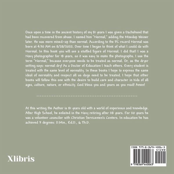 Once upon a time in the ancient history of my 81 years I was given a Dachshund that had been recovered from abuse. I named him "Normal," adding the Mixedup Weiner later. He was more mixed-up than normal. According to the PC record Normal was born at 4:30 AM on 8/28/2022. Over time I began to think of what I could do with Normal. In this book you will see a stuffed figure of Normal. I did that! I was a Navy photographer for 18 years, so it was easy to make the photographs. I use the term "Normal," because everyone needs to be treated as normal. Or, as the dryer setting says: normal dry! As a Doctor of Education I teach others. Every student is treated with the same level of normality. In these books I hope to express the same ideal of normality and respect all us dogs need to be treated. I hope that other books will follow this one with the desire to build care and character in kids of all ages, culture, nature, or ethnicity. God bless you and yours as you read! Amen!