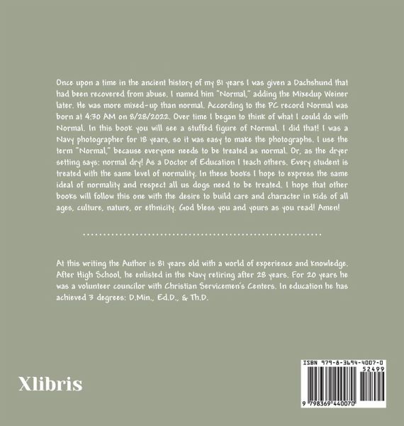 Once upon a time in the ancient history of my 81 years I was given a Dachshund that had been recovered from abuse. I named him "Normal," adding the Mixedup Weiner later. He was more mixed-up than normal. According to the PC record Normal was born at 4:30 AM on 8/28/2022. Over time I began to think of what I could do with Normal. In this book you will see a stuffed figure of Normal. I did that! I was a Navy photographer for 18 years, so it was easy to make the photographs. I use the term "Normal," because everyone needs to be treated as normal. Or, as the dryer setting says: normal dry! As a Doctor of Education I teach others. Every student is treated with the same level of normality. In these books I hope to express the same ideal of normality and respect all us dogs need to be treated. I hope that other books will follow this one with the desire to build care and character in kids of all ages, culture, nature, or ethnicity. God bless you and yours as you read! Amen!
