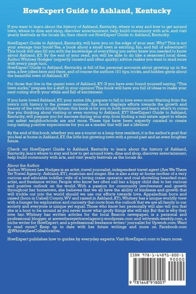 If you want to learn about the history of Ashland, Kentucky, where to stay and how to get around town, where to dine and shop, discover entertainment, help build community with arts, and visit yearly festivals as the locals do, then check out HowExpert Guide to Ashland, Kentucky. HowExpert Guide to Ashland, Kentucky, will have you on the edge of your seat. Why? This is not your average tour book! Yes, a book about a small town is exciting, fun, and full of adventure!!! This book will also fill you with the knowledge of everything you never knew you needed to know about Ashland, KY. By the end of your read, you will be able to do like a seasoned local does. Author Whitney Hodges' (expertly curated and often quirky) advice makes you want to read more with every page turn. HowExpert Guide to Ashland, Kentucky, is full of fun personal accounts about growing up in the area, a few jokes here and there, and of course the authors 101 tips, tricks, and hidden gems about the beautiful town of Ashland, KY. For those that live in the quaint town of Ashland, KY: If you have ever found yourself saying, "This town sucks," prepare for a shift in your opinion! This book will have you full of ideas to make your next outing worth your while and full of excitement. If you have loved Ashland, KY, your entire life, prepare to fall in love even more! Starting from the town's rich history to the present moment, this book displays efforts towards the growth and beauty of the town's bright future; this book is for you to both reminisce and learn what's to come. Are you thinking about visiting or even moving to Ashland, KY? HowExpert Guide to Ashland, Kentucky, will prepare you for success during your stay, from finding a real estate agent to where our safest neighborhoods are and more. These tips have been expertly curated to create long-lasting positive experiences for you as a reader that will last a lifetime! By the end of this book, whether you are a tourist or a long-time resident, it is the author's goal that you feel at home in Ashland, KY, the little but growing town with a proud past and an even brighter future. Check out HowExpert Guide to Ashland, Kentucky to learn about the history of Ashland, Kentucky, learn where to stay and how to get around town, dine and shop, discover entertainment, help build community with arts, and visit yearly festivals as the locals do. About the Author Author Whitney Lee Hodges is an artist, travel journalist, independent travel agent (Are We There Yet Travel Agency- Ashland, KY), musician and singer. She is also a stay-at-home mother of a very curious and adorable toddler; wife of a loving crane operator and coal shoveling bearded man; artist, and freelance writer. People who know her often call her a hippy child due to her curious and positive outlook on the world. With a passion for community involvement and growth throughout her hometown, she believes that we all have the ability of kindness and growth that will trickle out into the world should we use our efforts towards love. Appalachian born and raised (born in Cabell County, WV and raised in Ashland, KY), Whitney has a unique worldly view with a hunger for exploration and curiosity that roots from the outlook that we are all family in our society and everyone is unique yet equal. Those who know her personally will also tell you that she is a hoot to be around as you never know what goofy things she will say. But that is why they love her. Whitney has written articles for the local Beacon newspaper, is a personal and professional blogger, a niche writer for HowExpert, and a professional freelance writer/journalist for Upwork. HowExpert publishes how to guides by everyday experts.