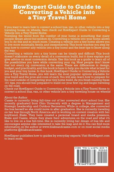 If you want to learn how to convert a school bus, van, or other vehicle into a tiny traveling house on wheels, then check out HowExpert Guide to Converting a Vehicle into a Tiny Travel Home. Traveling the world from the comfort of your home is something that many people dream about but seldom do. Converting a vehicle into your home allows you to do this and so much more. Creating a vehicle into a tiny home allows you to live more minimally, freely, and inexpensively. This book teaches you step by step how to convert any vehicle into a tiny home and the best tips to know along the way. Converting a vehicle into a tiny home can be timely and difficult. This book doesn't elaborate on every detail of a conversion build, but it does explain and give advice on most conversion details. Use this book as a guide to learn all of the possibilities you have while converting your rig. Most people don't know that not every rig conversion is the same. There are differences in design, budget, and practicality, and this book is here to help you decide what is best for you and your tiny home. In this book, HowExpert Guide to Converting a Vehicle into a Tiny Travel Home, you will learn the most popular options available for your build and the pros and cons of each. You will also learn how to prepare for the road outside of completing your tiny home build. As you finish reading these 101 tips, you should feel prepared to build out your first rig and begin traveling on the road. Check out HowExpert Guide to Converting a Vehicle into a Tiny Travel Home to convert a school bus, van, or other vehicle into a tiny traveling house on wheels! About the Author Cassie is currently living full-time out of her converted short school bus. She recently graduated from Ohio University with a degree in Management and Strategic Leadership and Outdoor Recreation. While in college, she converted the bus herself so she could move in after graduation. She is currently traveling on her bus through North America and is working on content creation with her boyfriend, Blake. They have created a personal brand and media presence, Blake and Cassie, where they share their adventures on the road and what it's like to live on a bus full-time. She is currently living her dream of bus life and encourages anyone else interested to take the leap and do it. HowExpert publishes how to guides by everyday experts.