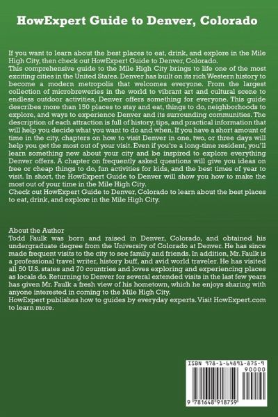 If you want to learn about the best places to eat, drink, and explore in the Mile High City, then check out HowExpert Guide to Denver, Colorado. This comprehensive guide to the Mile High City brings to life one of the most exciting cities in the United States. Denver has built on its rich Western history to become a modern metropolis that welcomes everyone. From the largest collection of microbreweries in the world to vibrant art and cultural scene to endless outdoor activities, Denver offers something for everyone. This guide describes more than 150 places to stay and eat, things to do, neighborhoods to explore, and ways to experience Denver and its surrounding communities. The description of each attraction is full of history, tips, and practical information that will help you decide what you want to do and when. If you have a short amount of time in the city, chapters on how to visit Denver in one, two, or three days will help you get the most out of your visit. Even if you're a long-time resident, you'll learn something new about your city and be inspired to explore everything Denver offers. A chapter on frequently asked questions will give you ideas on free or cheap things to do, fun activities for kids, and the best times of year to visit. In short, the HowExpert Guide to Denver will show you how to make the most out of your time in the Mile High City. Check out HowExpert Guide to Denver, Colorado to learn about the best places to eat, drink, and explore in the Mile High City. About the Author Todd Faulk was born and raised in Denver, Colorado, and obtained his undergraduate degree from the University of Colorado at Denver. He has since made frequent visits to the city to see family and friends. In addition, Mr. Faulk is a professional travel writer, history buff, and avid world traveler. He has visited all 50 U.S. states and 70 countries and loves exploring and experiencing places as locals do. Returning to Denver for several extended visits in the last few years has given Mr. Faulk a fresh view of his hometown, which he enjoys sharing with anyone interested in coming to the Mile High City. HowExpert publishes how to guides by everyday experts.
