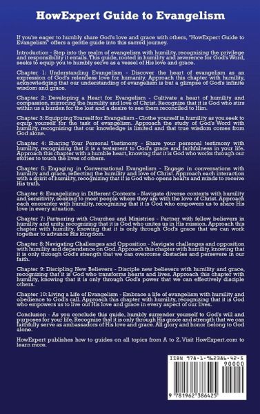 If you're eager to humbly share God's love and grace with others, "HowExpert Guide to Evangelism" offers a gentle guide into this sacred journey. Introduction Step into the realm of evangelism with humility, recognizing the privilege and responsibility it entails. This guide, rooted in humility and reverence for God's Word, seeks to equip you to humbly serve as a vessel of His love and grace. Chapter 1: Understanding Evangelism Discover the heart of evangelism as an expression of God's relentless love for humanity. Approach this chapter with humility, acknowledging that our understanding of evangelism is but a glimpse of God's infinite wisdom and grace. Chapter 2: Developing a Heart for Evangelism Cultivate a heart of humility and compassion, mirroring the humility and love of Christ. Recognize that it is God who stirs within us a burden for the lost and a desire to see them reconciled to Him. Chapter 3: Equipping Yourself for Evangelism Clothe yourself in humility as you seek to equip yourself for the task of evangelism. Approach the study of God's Word with humility, recognizing that our knowledge is limited and that true wisdom comes from God alone. Chapter 4: Sharing Your Personal Testimony Share your personal testimony with humility, recognizing that it is a testament to God's grace and faithfulness in your life. Approach this chapter with a humble heart, knowing that it is God who works through our stories to touch the lives of others. Chapter 5: Engaging in Conversational Evangelism Engage in conversations with humility and grace, reflecting the humility and love of Christ. Approach each interaction with a spirit of humility, recognizing that it is God who opens hearts and minds to receive His truth. Chapter 6: Evangelizing in Different Contexts Navigate diverse contexts with humility and sensitivity, seeking to meet people where they are with the love of Christ. Approach each encounter with humility, recognizing that it is God who empowers us to share His love in every situation. Chapter 7: Partnering with Churches and Ministries Partner with fellow believers in humility and unity, recognizing that it is God who unites us in His mission. Approach this chapter with humility, knowing that it is only through God's grace that we can work together to advance His kingdom. Chapter 8: Navigating Challenges and Opposition Navigate challenges and opposition with humility and dependence on God. Approach this chapter with humility, knowing that it is only through God's strength that we can overcome obstacles and persevere in our faith. Chapter 9: Discipling New Believers Disciple new believers with humility and grace, recognizing that it is God who transforms hearts and lives. Approach this chapter with humility, knowing that it is only through God's power that we can effectively disciple others. Chapter 10: Living a Life of Evangelism Embrace a life of evangelism with humility and obedience to God's call. Approach this chapter with humility, recognizing that it is God who empowers us to live out His love and grace in every aspect of our lives. Conclusion As you conclude this guide, humbly surrender yourself to God's will and purposes for your life. Recognize that it is only through His grace and strength that we can faithfully serve as ambassadors of His love and grace. All glory and honor belong to God alone. HowExpert publishes how to guides on all topics from A to Z.