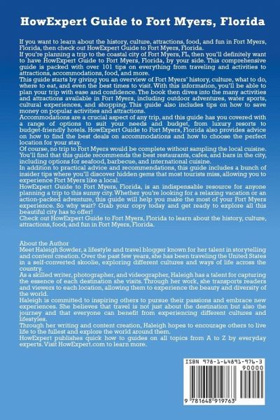If you want to learn about the history, culture, attractions, food, and fun in Fort Myers, Florida, then check out HowExpert Guide to Fort Myers, Florida. If you're planning a trip to the coastal city of Fort Myers, FL, then you'll definitely want to have HowExpert Guide to Fort Myers, Florida, by your side. This comprehensive guide is packed with over 101 tips on everything from traveling and activities to attractions, accommodations, food, and more. This guide starts by giving you an overview of Fort Myers' history, culture, what to do, where to eat, and even the best times to visit. With this information, you'll be able to plan your trip with ease and confidence. The book then dives into the many activities and attractions available in Fort Myers, including outdoor adventures, water sports, cultural experiences, and shopping. This guide also includes tips on how to save money on popular activities and attractions. Accommodations are a crucial aspect of any trip, and this guide has you covered with a range of options to suit your needs and budget, from luxury resorts to budget-friendly hotels. HowExpert Guide to Fort Myers, Florida also provides advice on how to find the best deals on accommodations and how to choose the perfect location for your stay. Of course, no trip to Fort Myers would be complete without sampling the local cuisine. You'll find that this guide recommends the best restaurants, cafes, and bars in the city, including options for seafood, barbecue, and international cuisine. In addition to practical advice and recommendations, this guide includes a bunch of insider tips where you'll discover hidden gems that most tourists miss, allowing you to experience Fort Myers like a local. HowExpert Guide to Fort Myers, Florida, is an indispensable resource for anyone planning a trip to this sunny city. Whether you're looking for a relaxing vacation or an action-packed adventure, this guide will help you make the most of your Fort Myers experience. So why wait? Grab your copy today and get ready to explore all this beautiful city has to offer! Check out HowExpert Guide to Fort Myers, Florida to learn about the history, culture, attractions, food, and fun in Fort Myers, Florida. About the Author Meet Haleigh Sowder, a lifestyle and travel blogger known for her talent in storytelling and content creation. Over the past few years, she has been traveling the United States in a self-converted skoolie, exploring different cultures and ways of life across the country. As a skilled writer, photographer, and videographer, Haleigh has a talent for capturing the essence of each destination she visits. Through her work, she transports readers and viewers to each location, allowing them to experience the beauty and diversity of the world. Haleigh is committed to inspiring others to pursue their passions and embrace new experiences. She believes that travel is not just about the destination but also the journey and that everyone can benefit from experiencing different cultures and lifestyles. Through her writing and content creation, Haleigh hopes to encourage others to live life to the fullest and explore the world around them. HowExpert publishes quick how to guides on all topics from A to Z by everyday experts. Visit HowExpert.com to learn more.