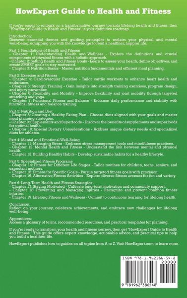 If you're eager to embark on a transformative journey towards lifelong health and fitness, then "HowExpert Guide to Health and Fitness" is your definitive roadmap. Introduction Part 1: Foundations of Health and Fitness - Chapter 1: Understanding Health and Wellness - Chapter 2: Setting Health and Fitness Goals - Chapter 3: Nutrition Basics Part 2: Exercise and Fitness - Chapter 4: Cardiovascular Exercise - Chapter 5: Strength Training - Chapter 6: Flexibility and Mobility - Chapter 7: Functional Fitness and Balance Part 3: Nutrition and Diet - Chapter 8: Creating a Healthy Eating Plan - Chapter 9: Supplements and Superfoods - Chapter 10: Special Dietary Considerations Part 4: Mental and Emotional Well-Being - Chapter 11: Managing Stress - Chapter 12: Mental Health and Fitness - Chapter 13: Building Healthy Habits Part 5: Specialized Fitness Programs - Chapter 14: Fitness for Different Life Stages - Chapter 15: Fitness for Specific Goals - Chapter 16: Alternative Fitness Activities Part 6: Long-Term Health and Fitness Strategies - Chapter 17: Staying Motivated - Chapter 18: Preventing and Managing Injuries - Chapter 19: Lifelong Fitness and Wellness Conclusion Appendices HowExpert publishes how to guides on all topics from A to Z.