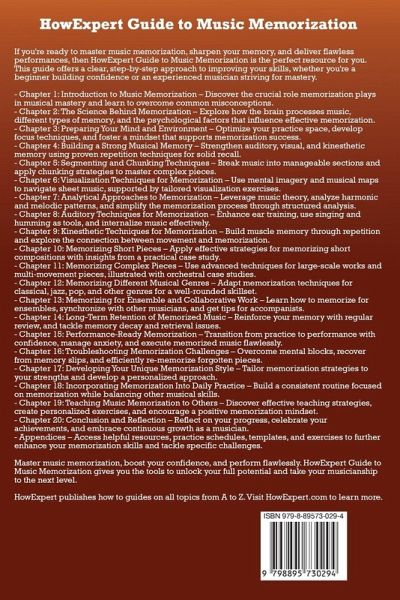 If you're ready to master music memorization, sharpen your memory, and deliver flawless performances, then HowExpert Guide to Music Memorization is the perfect resource for you. This guide offers a clear, step-by-step approach to improving your skills, whether you're a beginner building confidence or an experienced musician striving for mastery. Chapter 1: Introduction to Music Memorization - Discover the crucial role memorization plays in musical mastery and learn to overcome common misconceptions. Chapter 2: The Science Behind Memorization - Explore how the brain processes music, different types of memory, and the psychological factors that influence effective memorization. Chapter 3: Preparing Your Mind and Environment - Optimize your practice space, develop focus techniques, and foster a mindset that supports memorization success. Chapter 4: Building a Strong Musical Memory - Strengthen auditory, visual, and kinesthetic memory using proven repetition techniques for solid recall. Chapter 5: Segmenting and Chunking Techniques - Break music into manageable sections and apply chunking strategies to master complex pieces. Chapter 6: Visualization Techniques for Memorization - Use mental imagery and musical maps to navigate sheet music, supported by tailored visualization exercises. Chapter 7: Analytical Approaches to Memorization - Leverage music theory, analyze harmonic and melodic patterns, and simplify the memorization process through structured analysis. Chapter 8: Auditory Techniques for Memorization - Enhance ear training, use singing and humming as tools, and internalize music effectively. Chapter 9: Kinesthetic Techniques for Memorization - Build muscle memory through repetition and explore the connection between movement and memorization. Chapter 10: Memorizing Short Pieces - Apply effective strategies for memorizing short compositions with insights from a practical case study. Chapter 11: Memorizing Complex Pieces - Use advanced techniques for large-scale works and multi-movement pieces, illustrated with orchestral case studies. Chapter 12: Memorizing Different Musical Genres - Adapt memorization techniques for classical, jazz, pop, and other genres for a well-rounded skillset. Chapter 13: Memorizing for Ensemble and Collaborative Work - Learn how to memorize for ensembles, synchronize with other musicians, and get tips for accompanists. Chapter 14: Long-Term Retention of Memorized Music - Reinforce your memory with regular review, and tackle memory decay and retrieval issues. Chapter 15: Performance-Ready Memorization - Transition from practice to performance with confidence, manage anxiety, and execute memorized music flawlessly. Chapter 16: Troubleshooting Memorization Challenges - Overcome mental blocks, recover from memory slips, and efficiently re-memorize forgotten pieces. Chapter 17: Developing Your Unique Memorization Style - Tailor memorization strategies to your strengths and develop a personalized approach. Chapter 18: Incorporating Memorization Into Daily Practice - Build a consistent routine focused on memorization while balancing other musical skills. Chapter 19: Teaching Music Memorization to Others - Discover effective teaching strategies, create personalized exercises, and encourage a positive memorization mindset. Chapter 20: Conclusion and Reflection - Reflect on your progress, celebrate your achievements, and embrace continuous growth as a musician. Appendices - Access helpful resources, practice schedules, templates, and exercises to further enhance your memorization skills and tackle specific challenges. HowExpert Guide to Music Memorization gives you the tools to unlock your full potential and take your musicianship to the next level.