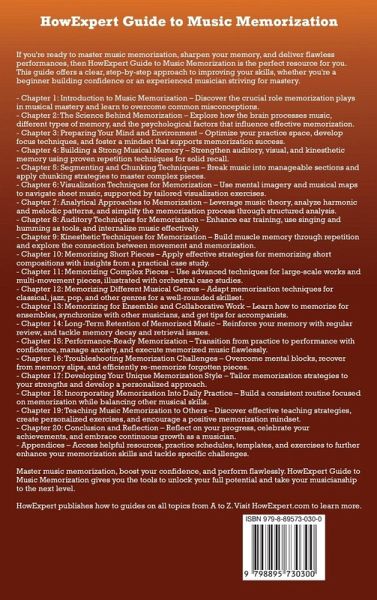 If you're ready to master music memorization, sharpen your memory, and deliver flawless performances, then HowExpert Guide to Music Memorization is the perfect resource for you. This guide offers a clear, step-by-step approach to improving your skills, whether you're a beginner building confidence or an experienced musician striving for mastery. Chapter 1: Introduction to Music Memorization - Discover the crucial role memorization plays in musical mastery and learn to overcome common misconceptions. Chapter 2: The Science Behind Memorization - Explore how the brain processes music, different types of memory, and the psychological factors that influence effective memorization. Chapter 3: Preparing Your Mind and Environment - Optimize your practice space, develop focus techniques, and foster a mindset that supports memorization success. Chapter 4: Building a Strong Musical Memory - Strengthen auditory, visual, and kinesthetic memory using proven repetition techniques for solid recall. Chapter 5: Segmenting and Chunking Techniques - Break music into manageable sections and apply chunking strategies to master complex pieces. Chapter 6: Visualization Techniques for Memorization - Use mental imagery and musical maps to navigate sheet music, supported by tailored visualization exercises. Chapter 7: Analytical Approaches to Memorization - Leverage music theory, analyze harmonic and melodic patterns, and simplify the memorization process through structured analysis. Chapter 8: Auditory Techniques for Memorization - Enhance ear training, use singing and humming as tools, and internalize music effectively. Chapter 9: Kinesthetic Techniques for Memorization - Build muscle memory through repetition and explore the connection between movement and memorization. Chapter 10: Memorizing Short Pieces - Apply effective strategies for memorizing short compositions with insights from a practical case study. Chapter 11: Memorizing Complex Pieces - Use advanced techniques for large-scale works and multi-movement pieces, illustrated with orchestral case studies. Chapter 12: Memorizing Different Musical Genres - Adapt memorization techniques for classical, jazz, pop, and other genres for a well-rounded skillset. Chapter 13: Memorizing for Ensemble and Collaborative Work - Learn how to memorize for ensembles, synchronize with other musicians, and get tips for accompanists. Chapter 14: Long-Term Retention of Memorized Music - Reinforce your memory with regular review, and tackle memory decay and retrieval issues. Chapter 15: Performance-Ready Memorization - Transition from practice to performance with confidence, manage anxiety, and execute memorized music flawlessly. Chapter 16: Troubleshooting Memorization Challenges - Overcome mental blocks, recover from memory slips, and efficiently re-memorize forgotten pieces. Chapter 17: Developing Your Unique Memorization Style - Tailor memorization strategies to your strengths and develop a personalized approach. Chapter 18: Incorporating Memorization Into Daily Practice - Build a consistent routine focused on memorization while balancing other musical skills. Chapter 19: Teaching Music Memorization to Others - Discover effective teaching strategies, create personalized exercises, and encourage a positive memorization mindset. Chapter 20: Conclusion and Reflection - Reflect on your progress, celebrate your achievements, and embrace continuous growth as a musician. Appendices - Access helpful resources, practice schedules, templates, and exercises to further enhance your memorization skills and tackle specific challenges. HowExpert Guide to Music Memorization gives you the tools to unlock your full potential and take your musicianship to the next level.