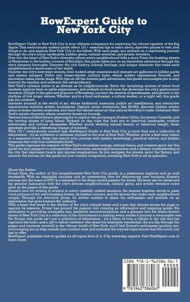 HowExpert Guide to New York City is your ultimate companion for exploring the vibrant tapestry of the Big Apple. This meticulously crafted guide offers 101+ essential tips to learn about, discover places to visit, find things to do, and explore New York City to the fullest. With each page, you embark on a captivating journey through the city's iconic landmarks, hidden gems, cultural enclaves, and artistic wonders. Dive into the heart of New York's diversity, where every neighborhood tells a story. From the bustling streets of Manhattan to the hidden corners of Brooklyn, this guide takes you on an immersive adventure through the city's dynamic boroughs. Discover the rich history, cultural heritage, and unique character that make each neighborhood a microcosm of the world. Uncover the city's best-kept secrets, from tucked-away museums and intimate art galleries to hidden parks and serene escapes. Delve into lesser-known cultural hubs, where artistic expressions flourish and innovation takes center stage. With tips on off-the-beaten-path adventures, this guide encourages you to step beyond the familiar and embrace the extraordinary. New York's culinary scene is as diverse as its neighborhoods. Savor the tantalizing aromas of street food markets, explore farm-to-table experiences, and embark on food tours that showcase the city's gastronomic wonders. Delight in the glitz and glamour of Broadway, uncover the secrets of speakeasies, and groove to the rhythms of live music venues. Whether you're a food enthusiast, a culture seeker, or a night owl, this guide has you covered. Immerse yourself in the world of art, where traditional museums, public art installations, and interactive experiences redefine artistic boundaries. Explore iconic institutions like MoMA, discover hidden artistic gems in lesser-known museums, and trace the vibrant street art that adorns Brooklyn's walls. Celebrate New York's artistic diversity, where creativity knows no bounds. Venture beyond Manhattan's skyscrapers to explore the picturesque Hudson Valley, the serene Catskills, and the inviting shores of Long Island. Embark on day trips that lead you to historical landmarks, outdoor adventures, and cultural escapades. Whether you're seeking natural beauty or historical insight, these getaways provide a refreshing change of scenery. With 101+ meticulously curated tips, HowExpert Guide to New York City is more than just a collection of information - it's an invitation to immerse yourself in the soul of New York. Whether you're a first-time visitor or a seasoned local, these tips enrich your journey with insider knowledge, practical advice, and hidden treasures that only true enthusiasts know. HowExpert Guide to New York City captures the essence of New York's boundless energy, cultural fusion, and creative spirit. Let this guide be your passport to unforgettable adventures, meaningful encounters, and a deeper understanding of the city that captivates hearts and ignites imaginations. As you navigate the streets, savor the flavors, and uncover the stories, let this guide be your trusted companion, revealing New York in all its splendor. About the Author Ernest Eyes, the author of this comprehensive New York City guide, is a passionate explorer and an avid wordsmith. With an insatiable curiosity and an unwavering love for discovering new horizons, Ernest's journey into the heart of NYC is a testament to his deep-rooted passion for travel. His keen eye for detail and his genuine fascination with the city's diverse neighborhoods, cultural gems, and artistic wonders come alive on the pages of this guide. HowExpert publishes how to guides on all topics from A to Z by everyday experts.
