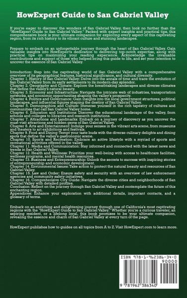 If you're eager to discover the wonders of San Gabriel Valley, then look no further than the "HowExpert Guide to San Gabriel Valley." Packed with expert insights and practical tips, this comprehensive book is your ultimate companion for exploring every aspect of this captivating region, from its rich history to its vibrant culture and stunning landscapes. Prepare to embark on an unforgettable journey through the heart of San Gabriel Valley. Gain valuable insights into HowExpert's dedication to delivering top-notch expertise, along with practical tips on maximizing your reading experience. Acknowledge the invaluable contributions and support of those who helped bring this guide to life, and set your intention to uncover the essence of San Gabriel Valley. Introduction: Step into the captivating world of San Gabriel Valley with a comprehensive overview of its geographical features, historical significance, and cultural diversity. Chapter 1. History of San Gabriel Valley: Delve into the annals of time and trace the evolution of San Gabriel Valley from its early settlements to its modern-day splendor. Chapter 2. Geography and Climate: Explore the breathtaking landscapes and diverse climates that define the valley's natural beauty. Chapter 3. Economy and Infrastructure: Navigate the intricate web of industries, transportation networks, and economic opportunities shaping the valley's prosperity. Chapter 4. Politics and Governance: Gain insights into the local government structures, political landscapes, and influential figures shaping the destiny of San Gabriel Valley. Chapter 5. Demographics and Culture: Immerse yourself in the rich tapestry of cultures and communities that call San Gabriel Valley home. Chapter 6. Education and Institutions: Discover the educational landscape of the valley, from schools and colleges to libraries and research institutions. Chapter 7. Attractions and Landmarks: Embark on a journey of discovery as you uncover the must-visit attractions and hidden gems of San Gabriel Valley. Chapter 8. Arts and Entertainment: Indulge your senses in the vibrant arts scene, from museums and theaters to art exhibitions and festivals. Chapter 9. Food and Dining: Tempt your taste buds with the diverse culinary delights and dining spots that define the valley's gastronomic scene. Chapter 10. Sports and Recreation: Embrace an active lifestyle with a myriad of sports and recreational activities offered in the valley. Chapter 11. Media and Communication: Stay informed and connected with the latest news and trends in San Gabriel Valley. Chapter 12. Health and Wellness: Prioritize your well-being with access to healthcare facilities, wellness programs, and mental health resources. Chapter 13. Business and Entrepreneurship: Unlock the secrets to success with inspiring stories of entrepreneurship and economic development. Chapter 14. Environmental Issues: Take action to protect the natural beauty and resources of San Gabriel Valley. Chapter 15. Law and Order: Ensure safety and security with an overview of law enforcement agencies and community safety initiatives. Chapter 16. Comprehensive City Guide: Navigate the diverse cities and neighborhoods of San Gabriel Valley with detailed profiles. Conclusion: Reflect on the journey through San Gabriel Valley and contemplate the future of this enchanting region. Appendices: Enhance your exploration with additional details, important contacts, and a glossary of terms. Embark on an enriching and enlightening journey through one of California's most captivating regions with the "HowExpert Guide to San Gabriel Valley." Whether you're a curious traveler, an aspiring resident, or a lifelong local, this book promises to be your ultimate companion, revealing the essence and charm of San Gabriel Valley at every turn of the page. HowExpert publishes how to guid