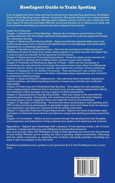 If you're passionate about trains and want to elevate your train spotting experience, HowExpert Guide to Train Spotting is your ultimate companion. This guide takes you on a comprehensive journey through train spotting, offering expert insights, practical advice, and a deep dive into every aspect of this beloved hobby. Whether you're just starting out or refining your skills, this book provides everything you need to become a seasoned train spotter. Inside, You'll Discover: Chapter 1: Introduction to Train Spotting - Explore the rich history and evolution of train spotting. Discover why this hobby captivates enthusiasts and the enduring appeal that keeps the community thriving. Chapter 2: Mastering Train Spotting Skills - Equip yourself with essential skills every train spotter needs. Learn how to observe and identify trains, record sightings, and follow safety guidelines for a rewarding experience. Chapter 3: Identifying and Spotting Trains - Dive into the excitement of discovering and identifying all types of trains, from classic steam engines to modern marvels. Get expert tips to help you spot and identify the full spectrum of locomotives. Chapter 4: Exploring Iconic Train Spotting Locations - Travel the globe as you uncover the best locations for spotting, from bustling urban centers to quiet rural outposts. Chapter 5: Technical and Mechanical Aspects of Trains - Delve into the mechanics of locomotives and understand the technology that powers trains. Learn about the differences between electric, diesel, and steam engines, and explore the evolution of train technology. Chapter 6: Engaging with the Railfan Community - Train spotting isn't just a hobby; it's a community. Learn how to connect with fellow enthusiasts, share experiences, and contribute to preserving railway heritage. Chapter 7: Legal and Ethical Considerations - Stay informed about rail safety regulations, legal boundaries, and ethical spotting practices to ensure your activities are conducted responsibly. Chapter 8: Preserving and Celebrating Train Spotting - Your passion for train spotting can leave a lasting impact. Discover how to document your journey, support preservation efforts, and celebrate railway heritage, leaving a legacy for future generations. Chapter 9: Expanding Your Train Spotting Hobby - Take your hobby to the next level by exploring photography, videography, and combining train spotting with travel. Capture stunning images, create engaging videos, and make the most of your adventures. Chapter 10: Spotlight on Technology - Embrace the latest technologies in train spotting, from GPS tracking and drone photography to specialized apps. Learn how these tools can enhance your experience and keep you connected with the global community. Chapter 11: Specialty Trains and Unique Experiences - Explore the world of specialty trains, participate in historical reenactments, and discover unique train spotting practices around the globe. Chapter 12: Conclusion - Reflect on your journey through train spotting with final thoughts, encouragement, and inspiration to keep pursuing your passion and exploring new horizons. Appendices - Expand your knowledge with a glossary of train spotting terms, a list of iconic locations, a sample spotting log, and additional recommended resources. Start your journey today with HowExpert Guide to Train Spotting and unlock the full potential of your hobby. Whether you're seeking the thrill of spotting unique locomotives, connecting with the railfan community, or exploring new locations, this guide provides everything you need to take your passion to the next level. HowExpert publishes how to guides on all topics from A to Z.