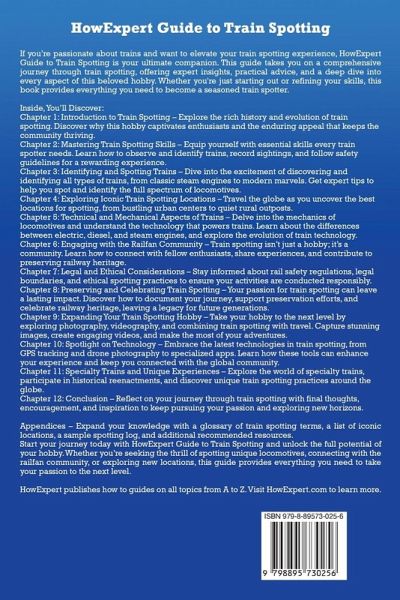If you're passionate about trains and want to elevate your train spotting experience, HowExpert Guide to Train Spotting is your ultimate companion. This guide takes you on a comprehensive journey through train spotting, offering expert insights, practical advice, and a deep dive into every aspect of this beloved hobby. Whether you're just starting out or refining your skills, this book provides everything you need to become a seasoned train spotter. Inside, You'll Discover: Chapter 1: Introduction to Train Spotting - Explore the rich history and evolution of train spotting. Discover why this hobby captivates enthusiasts and the enduring appeal that keeps the community thriving. Chapter 2: Mastering Train Spotting Skills - Equip yourself with essential skills every train spotter needs. Learn how to observe and identify trains, record sightings, and follow safety guidelines for a rewarding experience. Chapter 3: Identifying and Spotting Trains - Dive into the excitement of discovering and identifying all types of trains, from classic steam engines to modern marvels. Get expert tips to help you spot and identify the full spectrum of locomotives. Chapter 4: Exploring Iconic Train Spotting Locations - Travel the globe as you uncover the best locations for spotting, from bustling urban centers to quiet rural outposts. Chapter 5: Technical and Mechanical Aspects of Trains - Delve into the mechanics of locomotives and understand the technology that powers trains. Learn about the differences between electric, diesel, and steam engines, and explore the evolution of train technology. Chapter 6: Engaging with the Railfan Community - Train spotting isn't just a hobby; it's a community. Learn how to connect with fellow enthusiasts, share experiences, and contribute to preserving railway heritage. Chapter 7: Legal and Ethical Considerations - Stay informed about rail safety regulations, legal boundaries, and ethical spotting practices to ensure your activities are conducted responsibly. Chapter 8: Preserving and Celebrating Train Spotting - Your passion for train spotting can leave a lasting impact. Discover how to document your journey, support preservation efforts, and celebrate railway heritage, leaving a legacy for future generations. Chapter 9: Expanding Your Train Spotting Hobby - Take your hobby to the next level by exploring photography, videography, and combining train spotting with travel. Capture stunning images, create engaging videos, and make the most of your adventures. Chapter 10: Spotlight on Technology - Embrace the latest technologies in train spotting, from GPS tracking and drone photography to specialized apps. Learn how these tools can enhance your experience and keep you connected with the global community. Chapter 11: Specialty Trains and Unique Experiences - Explore the world of specialty trains, participate in historical reenactments, and discover unique train spotting practices around the globe. Chapter 12: Conclusion - Reflect on your journey through train spotting with final thoughts, encouragement, and inspiration to keep pursuing your passion and exploring new horizons. Appendices - Expand your knowledge with a glossary of train spotting terms, a list of iconic locations, a sample spotting log, and additional recommended resources. Start your journey today with HowExpert Guide to Train Spotting and unlock the full potential of your hobby. Whether you're seeking the thrill of spotting unique locomotives, connecting with the railfan community, or exploring new locations, this guide provides everything you need to take your passion to the next level. HowExpert publishes how to guides on all topics from A to Z.