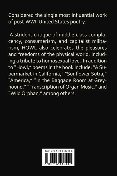 Considered the single most influential work of post-WWII United States poetry. A strident critique of middle-class complacency, consumerism, and capitalist militarism, HOWL also celebrates the pleasures and freedoms of the physical world. In addition to "Howl," poems in the book include: "A Supermarket in California," "Sunflower Sutra," "America," "In the Baggage Room at Greyhound," "Transcription of Organ Music," and "Wild Orphan," among others.