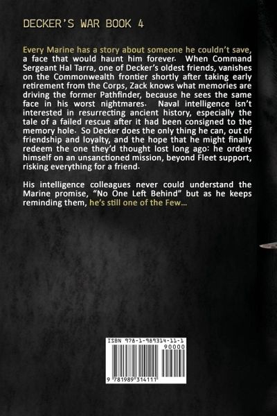 Every Marine has a story about someone he couldn't save, a face that would haunt him forever. When Command Sergeant Hal Tarra, one of Decker's oldest friends, vanishes on the Commonwealth frontier shortly after taking early retirement from the Corps, Zack knows what memories are driving the former Pathfinder, because he sees the same face in his worst nightmares. Naval intelligence isn't interested in resurrecting ancient history, especially the tale of a failed rescue after it had been consigned to the memory hole. So Decker does the only thing he can, out of friendship and loyalty, and the hope that he might finally redeem the one they'd thought lost long ago: he orders himself on an unsanctioned mission, beyond Fleet support, risking everything for a friend. His intelligence colleagues never could understand the Marine promise, "No One Left Behind" but as he keeps reminding them, he's still one of the Few…