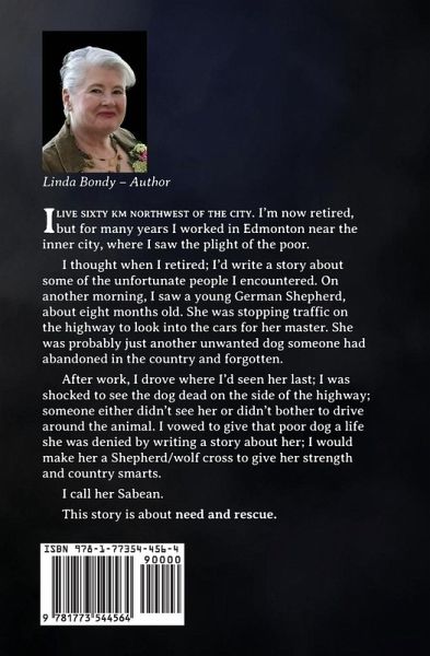 Linda Bondy is now retired, but for many years, she worked in Edmonton near the inner city where she saw the plight of the poor.After retirement, she thought she'd write a story about some of the unfortunate people she'd encountered. However, on one morning, she saw a young German Shepherd, about eight months old, stopping traffic on the road to look into the cars for her master. She was probably just another unwanted dog someone had abandoned in the country and forgotten. After work, she drove where she'd seen the dog last and was shocked to see her dead on the side of the road. She named her Sabean. Her first book, Howls of the Forgotten, is inspired by this incident