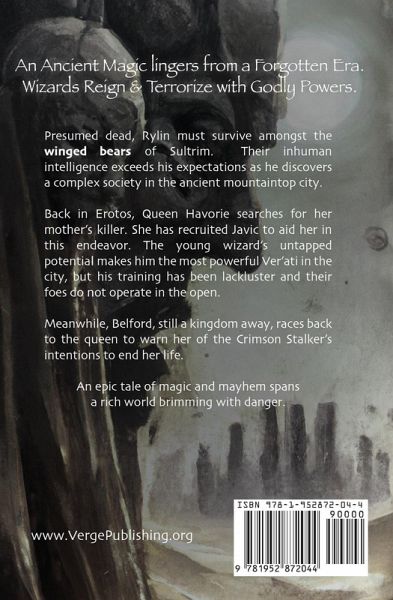 Ver'ati are wizards trained to use the Power for war...Goblikans are dark wizards-twisted to fight for the enemy...And Whunes...? Well... once, they were human...Now, they're your worst nightmare. An Ancient Magic lingers from a Forgotten Era. Wizards Reign & Terrorize with Godly Powers. ¿¿¿¿¿ Highly Rated Series A captivating world reminiscent of Game of Thrones and The Wheel of Time. Presumed dead, Rylin must survive amongst the winged bears of Sultrim. Their inhuman intelligence exceeds his expectations as he discovers a complex society in the ancient mountaintop city. Back in Erotos, Queen Havorie searches for her mother's killer. She has recruited Javic to aid her in this endeavor. The young wizard's untapped potential makes him the most powerful Ver'ati in the city, but his training has been lackluster and their foes do not operate in the open. Meanwhile, Belford, still a kingdom away, races back to the queen to warn her of the Crimson Stalker's intentions to end her life. An epic tale of magic and mayhem spans a rich world brimming with danger.